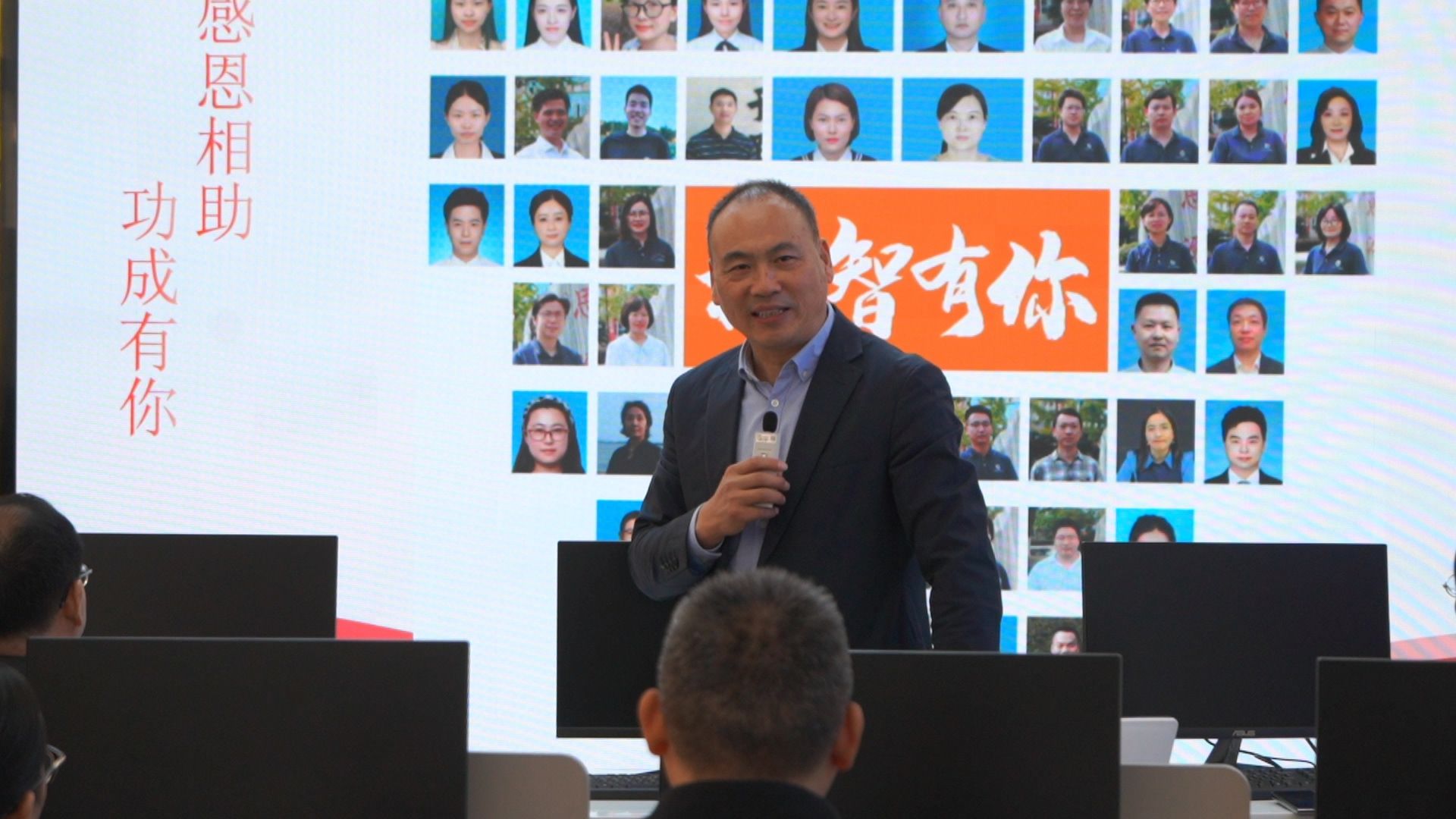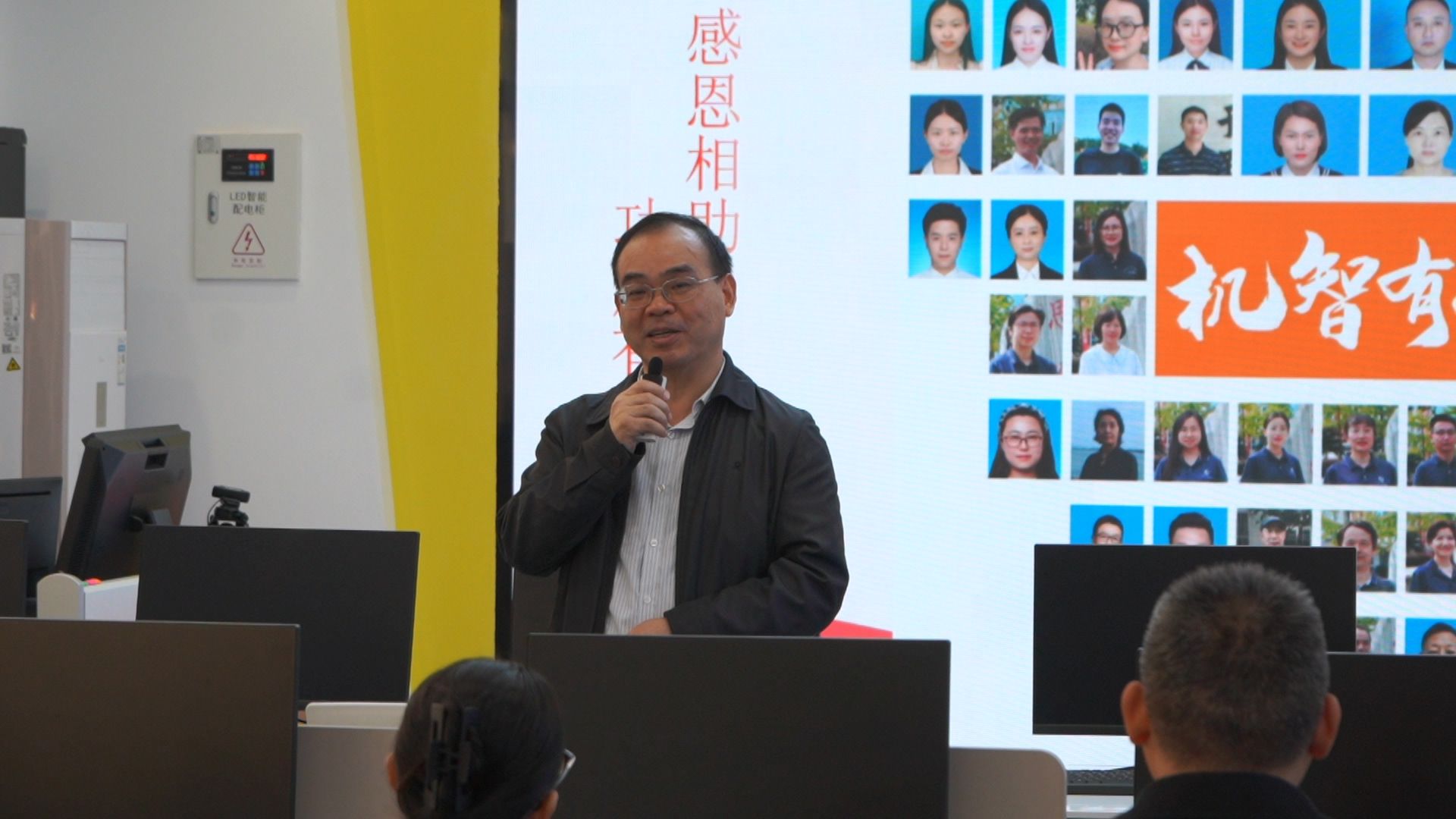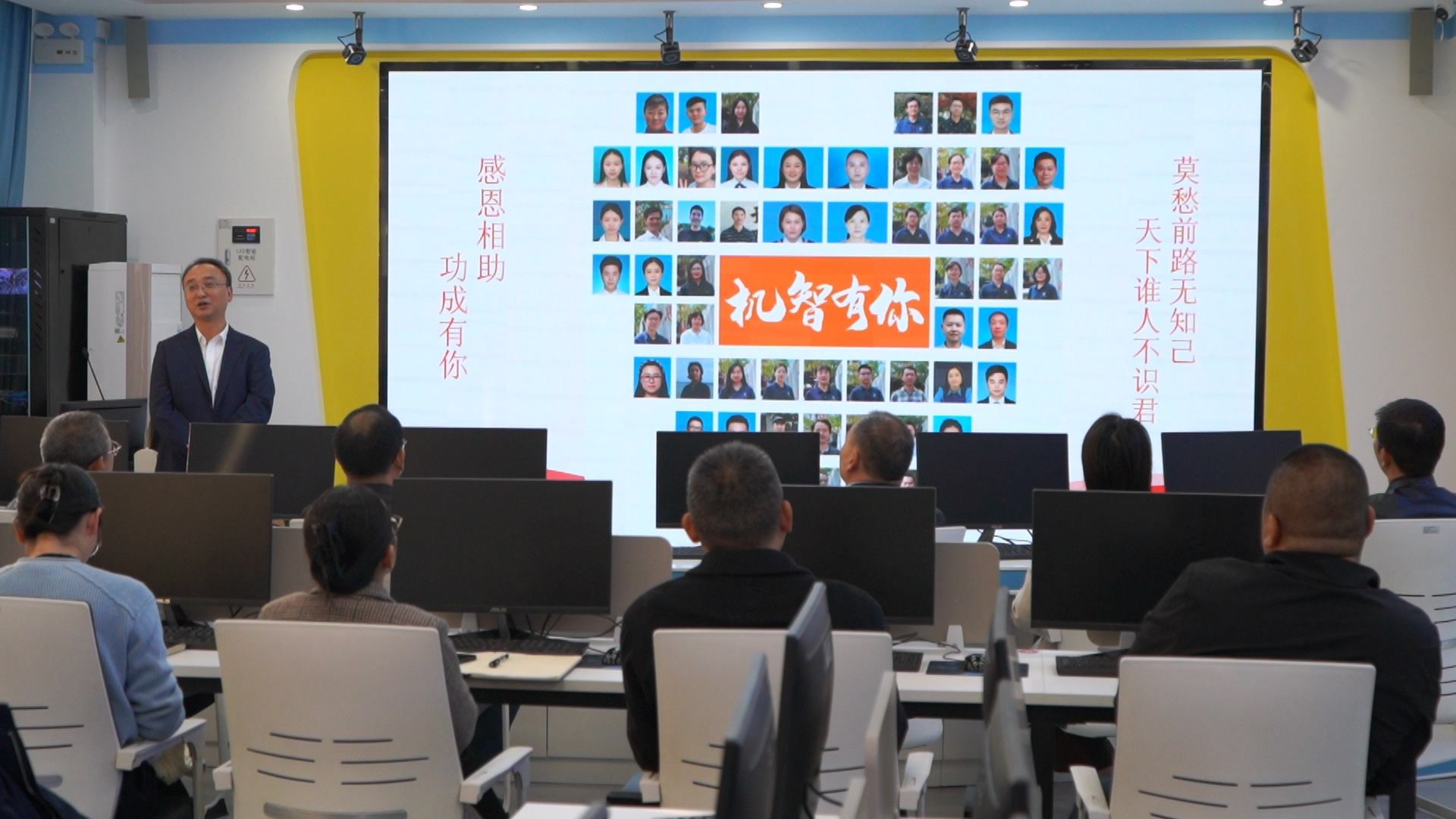 参观结束后,全体人员齐聚智能制造虚拟仿真实训中心,听取机电工程学院院长熊巍的成果汇报。熊院长从党建、校企合作、师资队伍、实训平台、育人体系五个维度展开,重点介绍学院多元校企育人模式的四大特色:与奥的斯合作推行现代学徒制实景培养,携手小鹏汽车开展订单班定向培养,联合华星光电创新“三段贯通 五级跃迁”现场工程师培养模式,联动汇川技术打造“汇英班”专项集训模式。在这些模式的赋能下,学生深度融入企业培训内容、考核标准与职业素养要求,实现从“懒散青年”到“奋斗青年”的蜕变,就业竞争力与职业发展潜力显著提升。