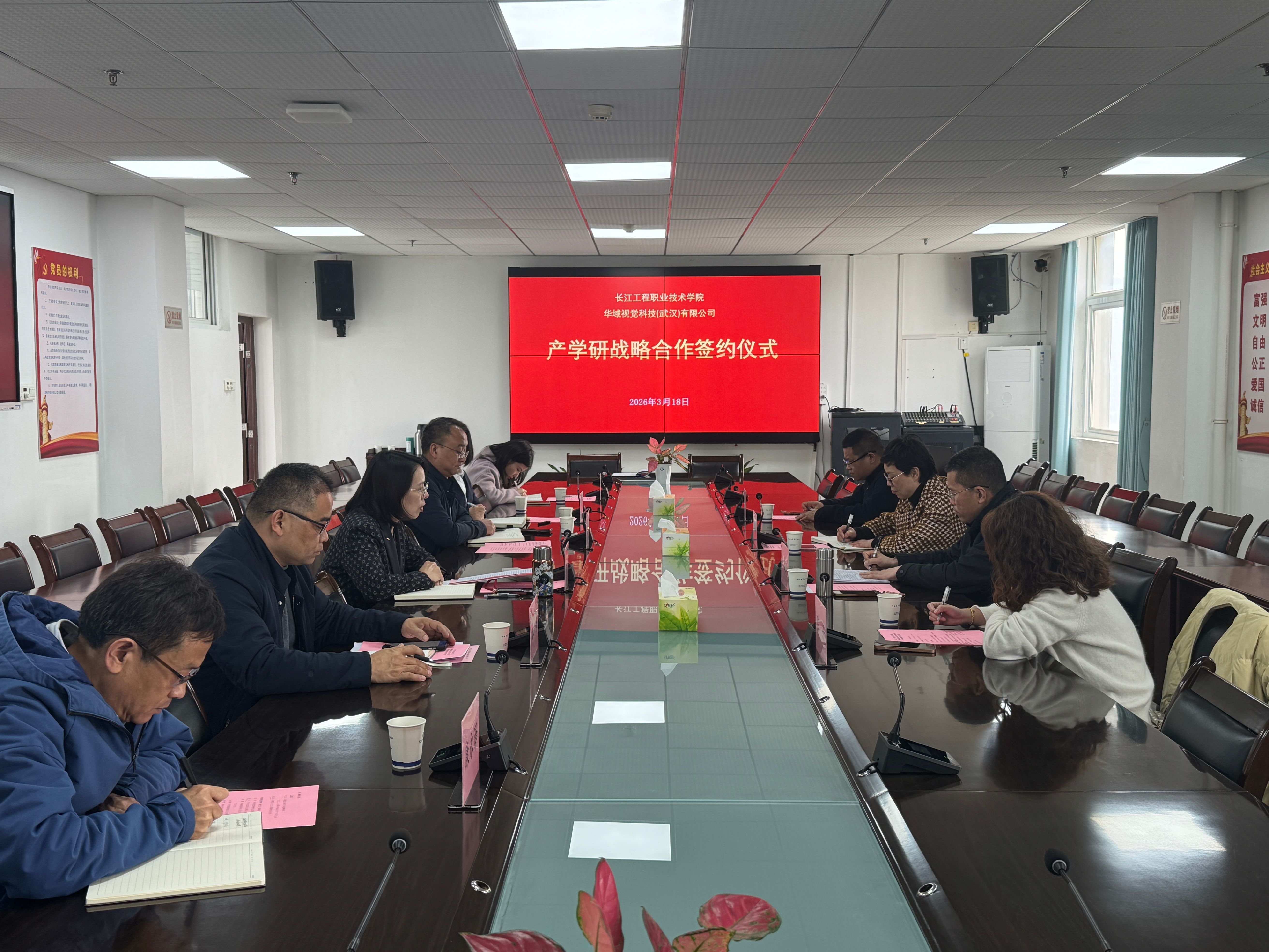 签约仪式上,与会领导热烈交流。陈欣指出,学校作为扎根江夏、服务湖北的高职院校,近年来在江夏区委、区政府的领导下,抢抓职教改革机遇,办学实力持续提升。学校机电工程学院作为产教融合的核心阵地,已与多家知名企业建立深度合作,此次在江夏区委、区政府的大力支持下,与华域视觉的携手,是学校深化产教融合的又一重要举措。